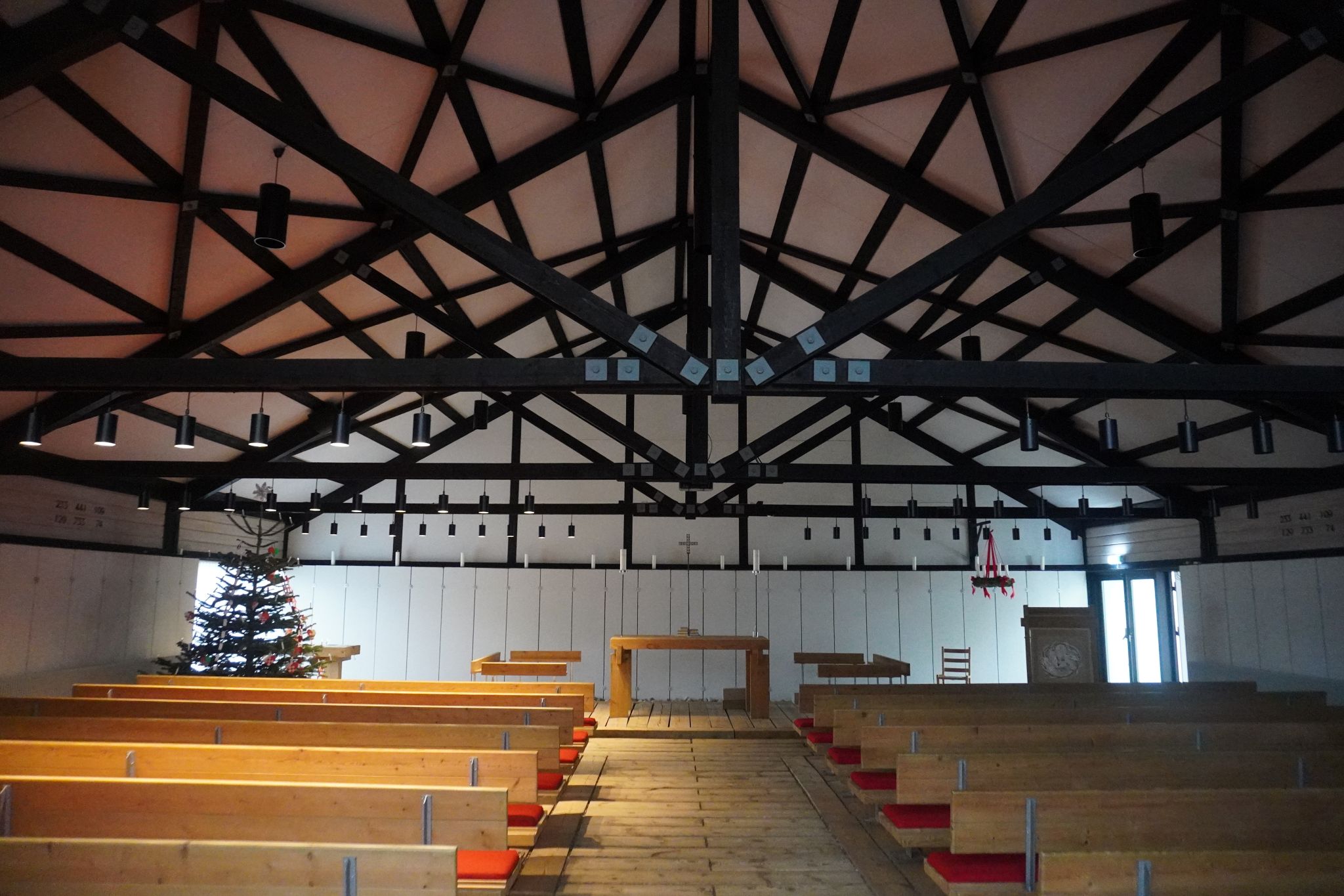 Det sorte bærende loftsparti med små lysspots der et tilføjet, giver en stærk kontrast til fyrretræsmøblerne i den lille kirke.