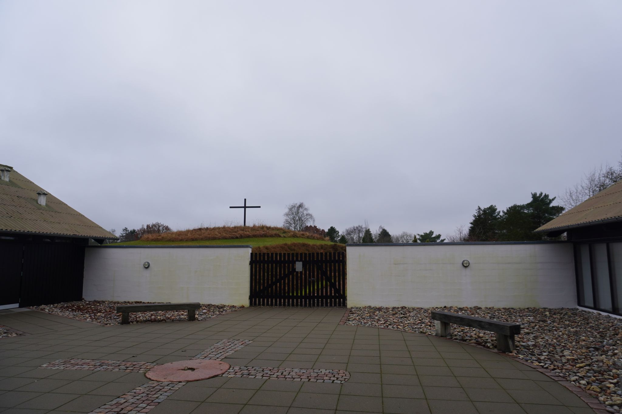 Kirken ligger ved siden af en fredet gravhøj fra bronzealderen, som er udsmykket med et kors på toppen af den.