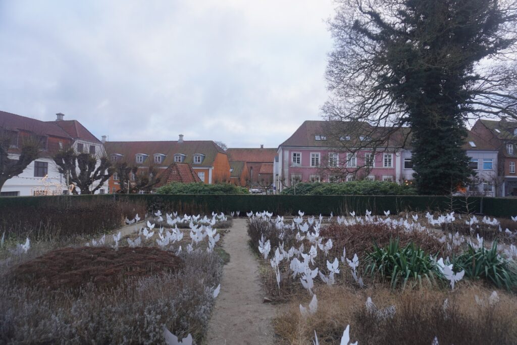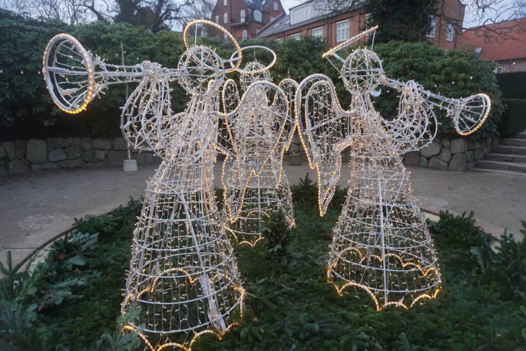 Englepapirs temaet går igen i Latinerhaven (som engang var en del af Viborg Katedralskole), hvor du også kan se store lyskulpturer som forestiller engle, der spiller trompet.