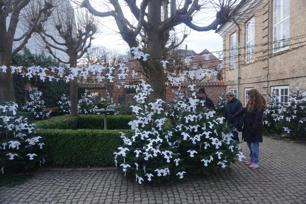 I en lille baggård kan du skrive hilsener til de afdøde på nogle hvide kartonstykker som er udformet som en engel, og pynte de små juletrøer med dem.