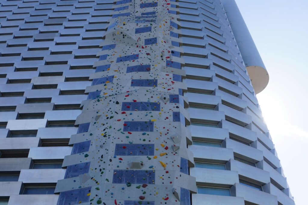 Det er også muligt at prøve kræfter med verdens højeste udendørs klatrevæg, der rejser sig langs bygningens facade.