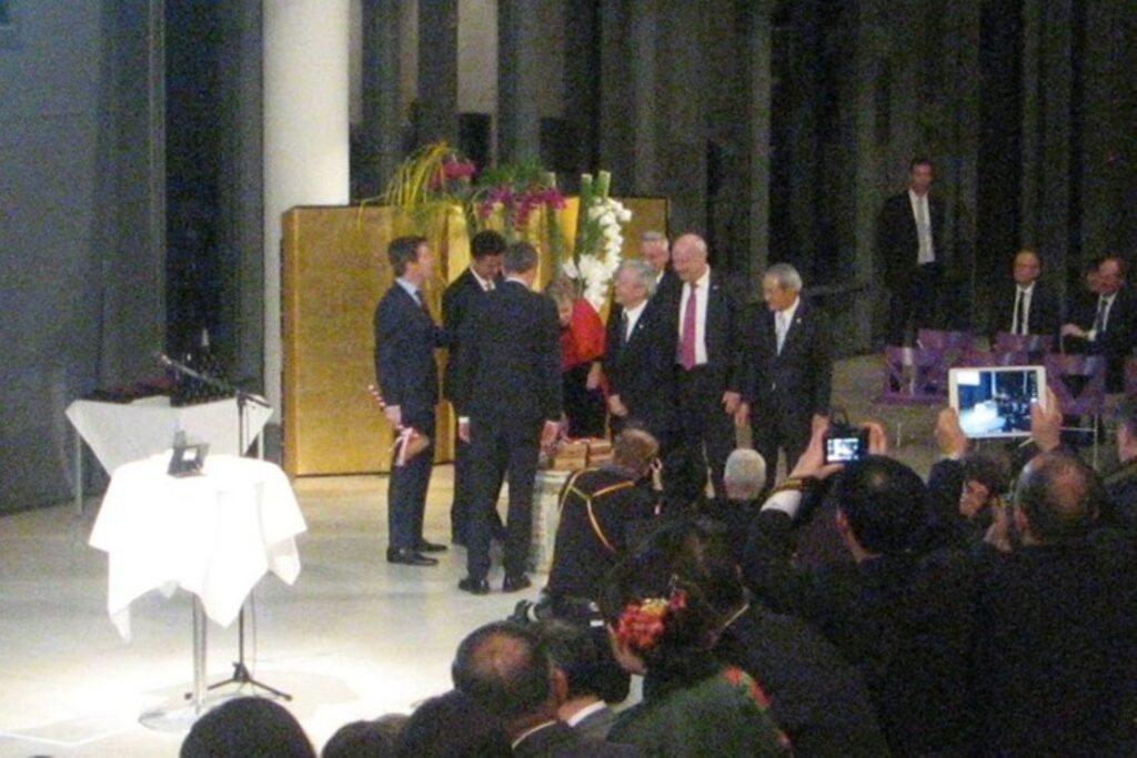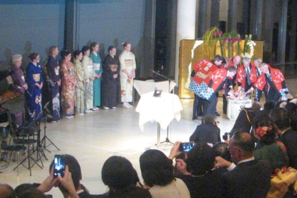 Kronprins Frederik var også til stede ved ferniseringen. Her blev han sammen med nogle af de andre talere iklædt en japansk kappe.