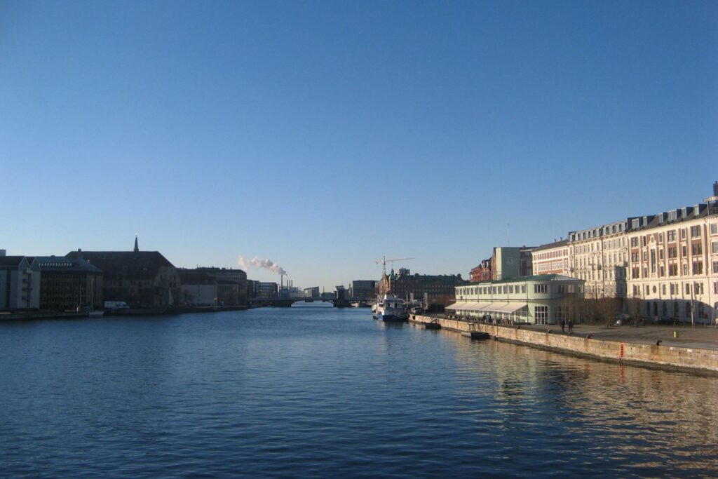 Til højre ses Gammelholm Toldkammer som er en karakteristisk funktionalistisk bygning tegnet af Kristoffer Varming. I dag fungerer den grønne historiske bygningsværk som en restaurant.