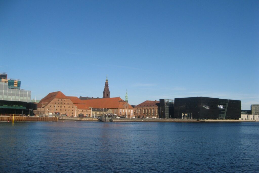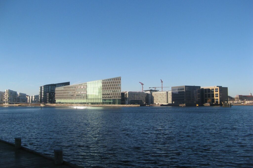 Tættest mod Indre by ses Den Sorte Diamant på Slotsholmen, som åbnede i 1998. Kulturhuset, der er tegnet af Schmidt Hammer Lassen, fungerer som en tilbygning til Det Kongelige Bibliotek, Lidt længere nede af havnefronten ses Bryggebroen som leder over mod Fisketorvet.