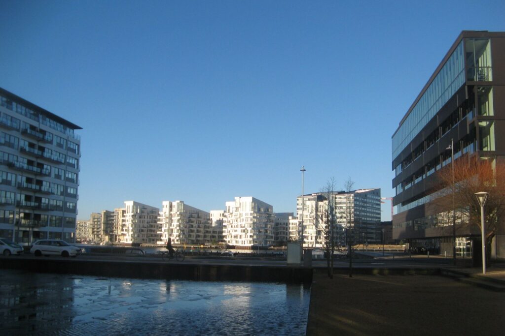 Længere nede af Islands Brygge ses de nye eksklusive beboelsesbygninger ved Tangholmen.
