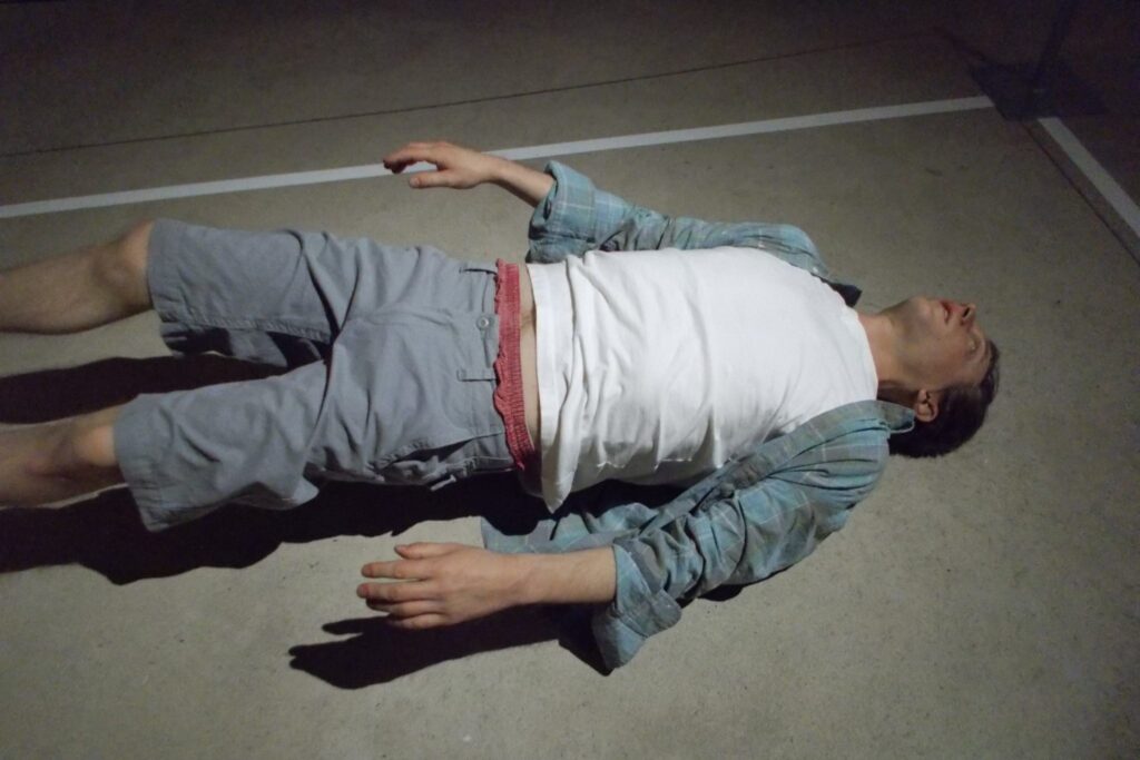 Tony Matelli har lavet en skulptur af et menneske som svæver i en akavet situation med benpartiet er lidt højere end hovedet.