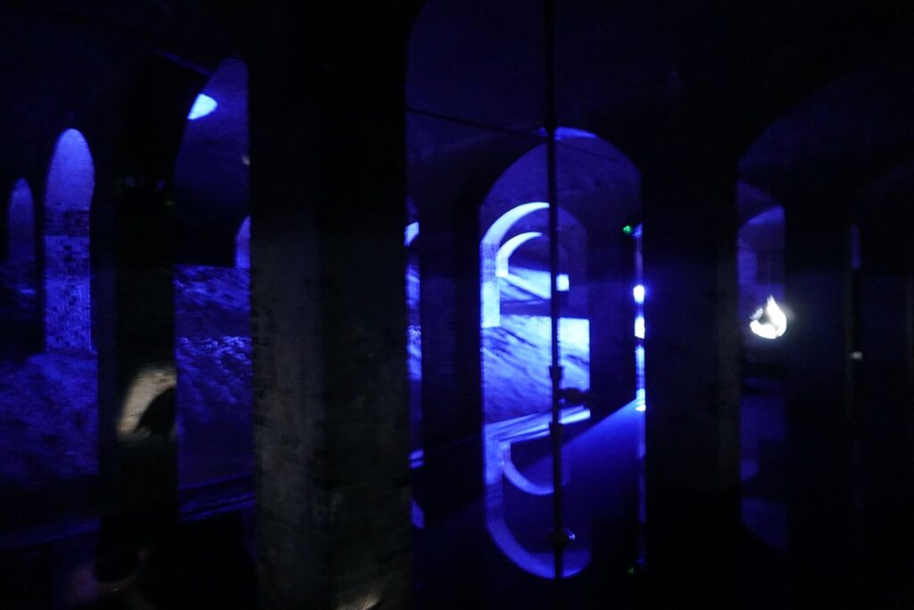 I den underjordiske og fugtige atmosfære i Cisternerne skaber Steensen en stemningsfuld og fordybende oplevelse, hvor publikum inviteres til at bevæge sig rundt i et omsluttende univers af lys, lyd og billeder.
