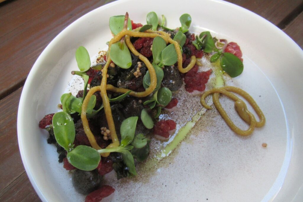 Spisestedet serverer moderne velsmagende estisk mad inde i et grønt baggård.