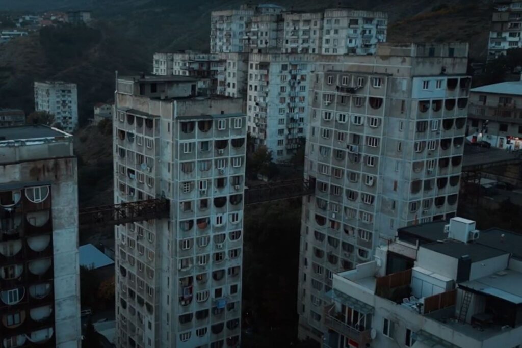 Det som gør dem kendt, også udenfor Georgiens grænser, er himmelbroerne som forbinder beboelseslejlighederne i 14. etagers højde.