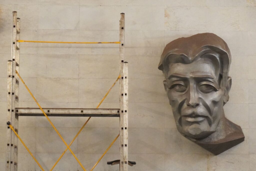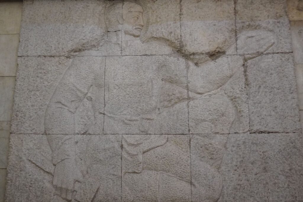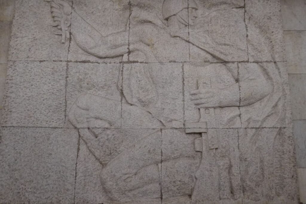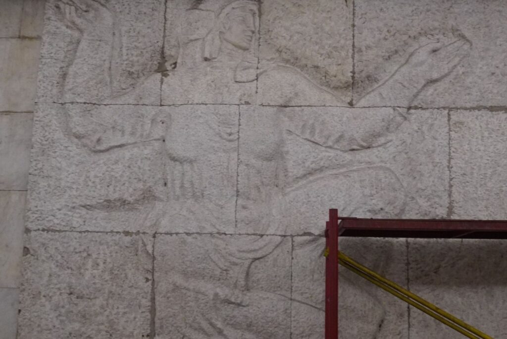 Reliefferne forestiller det hårdt arbejdende folk, som var et yndet motiv i Sovjetunionen.