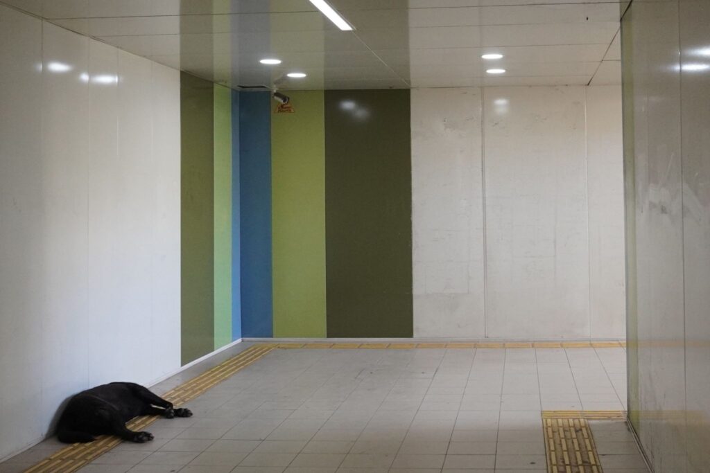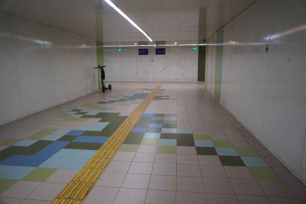 Af alle metrostationer er Teknisk Universitet den mest snukke. Langs væggende er der i dag reklamelystavler som fungerer fint farvemæssigt med det øvrige design.