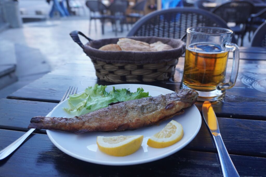 Det er billig at gå ud og spise og drikke for en dansk turist i Tbilisi. Midt i turistområdet kostede en stegt fisk med brød og en øl 50 danske kroner. Hvilket er det samme som en McDonalds meal koster i landet.