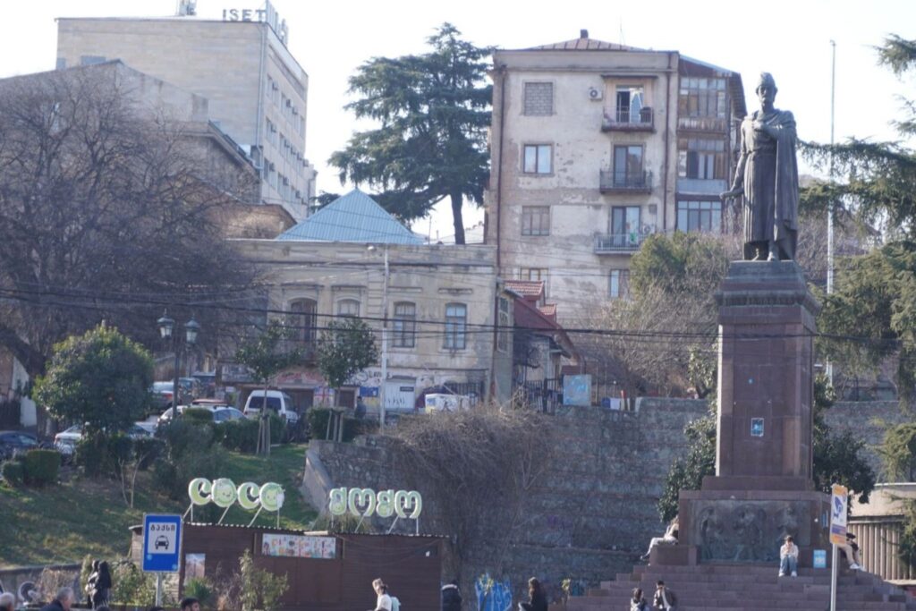 Shota Rustaveli er navnet på Georgiens nationalpoet. Han levede i middelalderen. Men er i dag vakt til live mange steder i byen. Han har både en lufthavn og en metrostation opkaldt efter sig. Og på billedet ses også en skulptur som ærer den gamle digter.