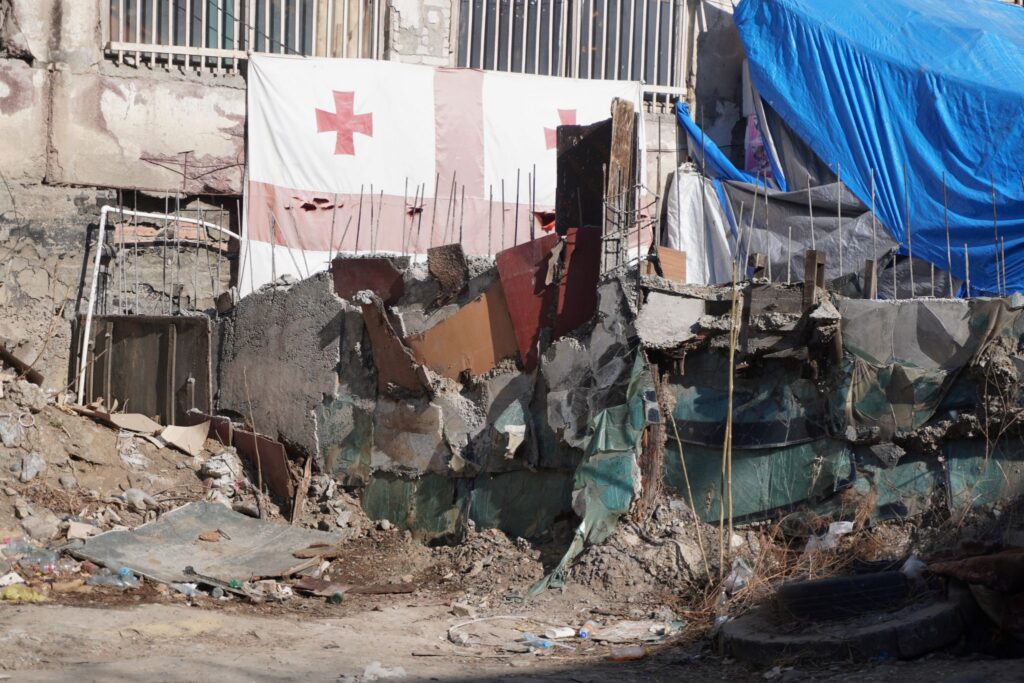 På en nedlagt fabriksbygning hænger et falmet georgisk nationalflag. Flaget som indeholder det store Sankt George kors og fire små georgiske korse, blev oprindelig brugt i middelalderen.