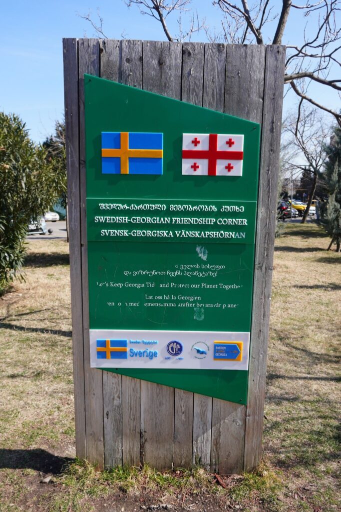 At diplomati ikke behøver at udspille sig i magtens korridorer inde i centrum af byen, er denne skilt som hedder Svensk-Georgisk venskabshjørne et bevis for. Da den befinder sig langt ude i forstæderne i en park med masse af socialt byggeri omkring det.
