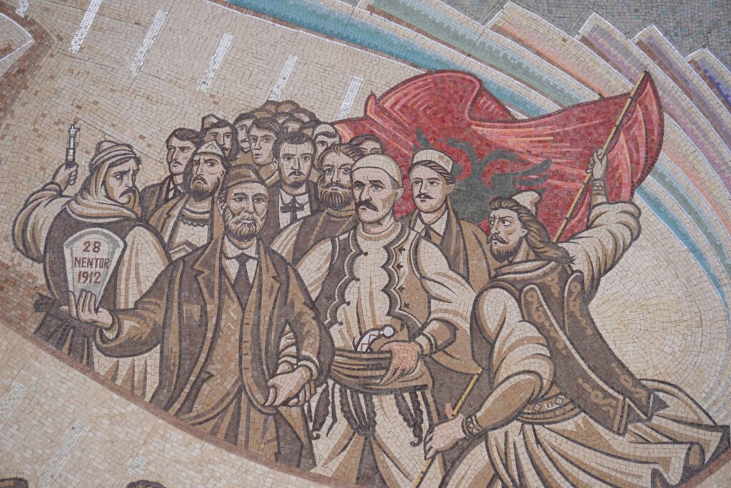 I hovedmosaikken bliver vi også oplyst om dengang albanerne begyndte at bruge det latinske alfabet, og begivenhederne under den 1. balkankrig, som førte til oprettelsen af Albanien i 1912.