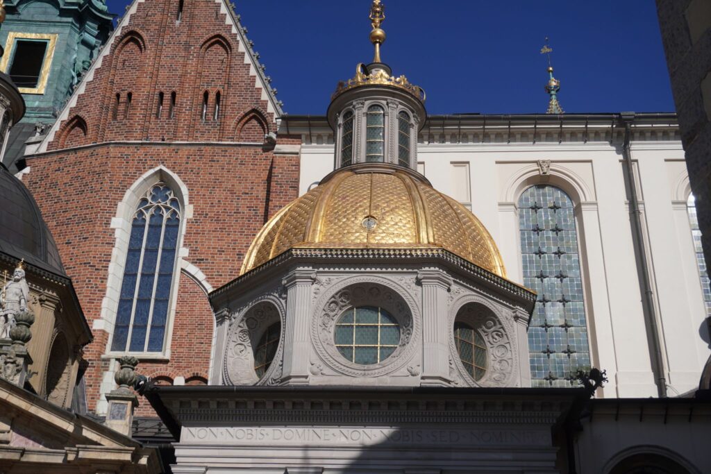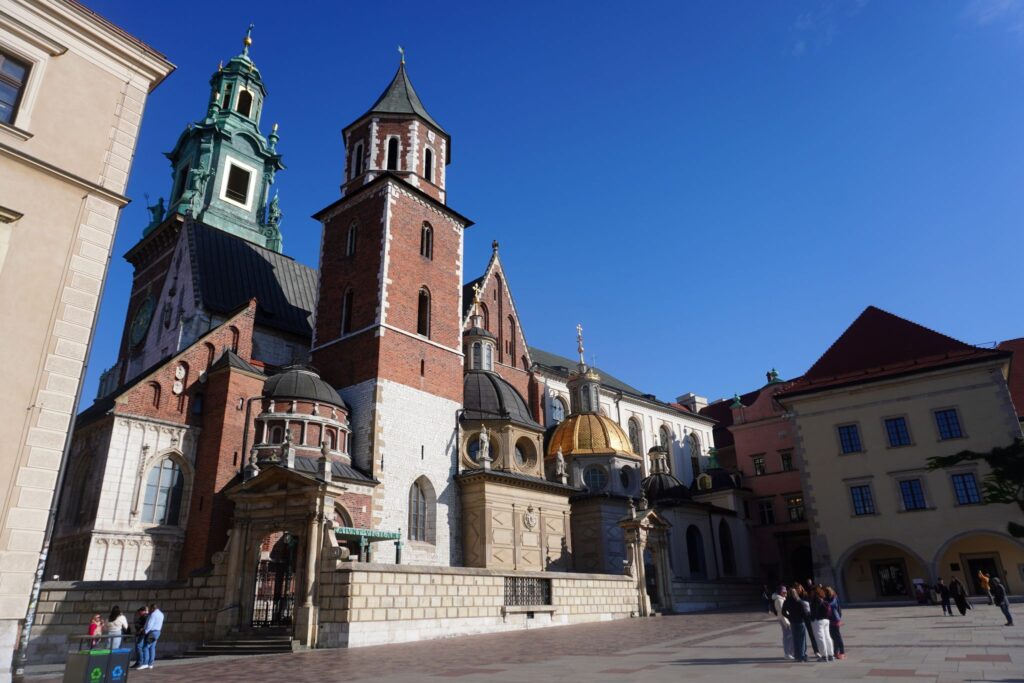 Oppe ved selve slotspladsen pryder den store Wawel Katedral, hvor den guldbelagte tårn i midten af den blev udført på ordre af Władysław II Jagiełło.