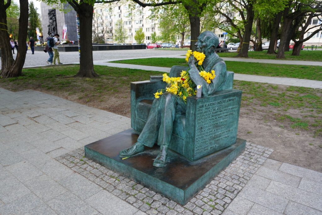 Selv skulpturen som portrætterer en siddende udgave af den polske diplomat og modstandsmand Jan Karski var dækket til med gule påskeliljer.