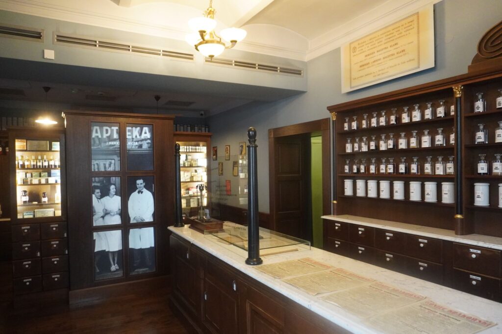 I en hjørne af pladsen ses et autentisk apotek hvis indretning svarer til hvordan den så ud under krigen.