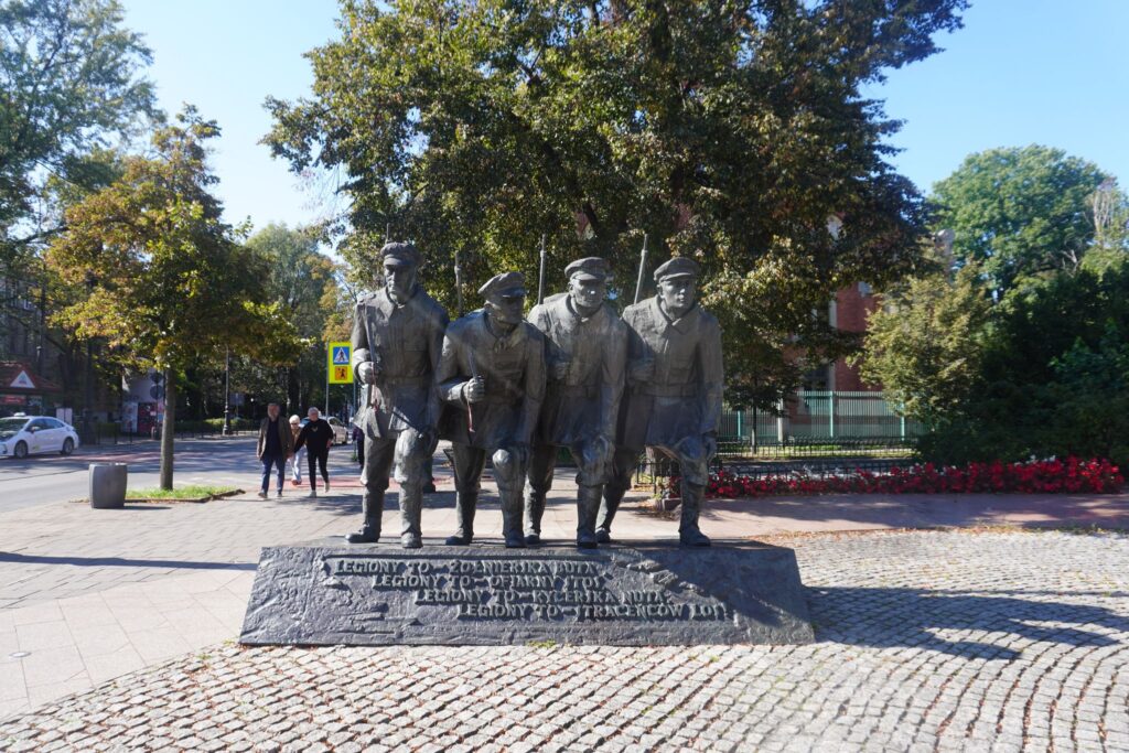 Ved siden af skulpturen af Piłsudski står fire legionærer som kæmpede sammen med ham under første verdenskrig.