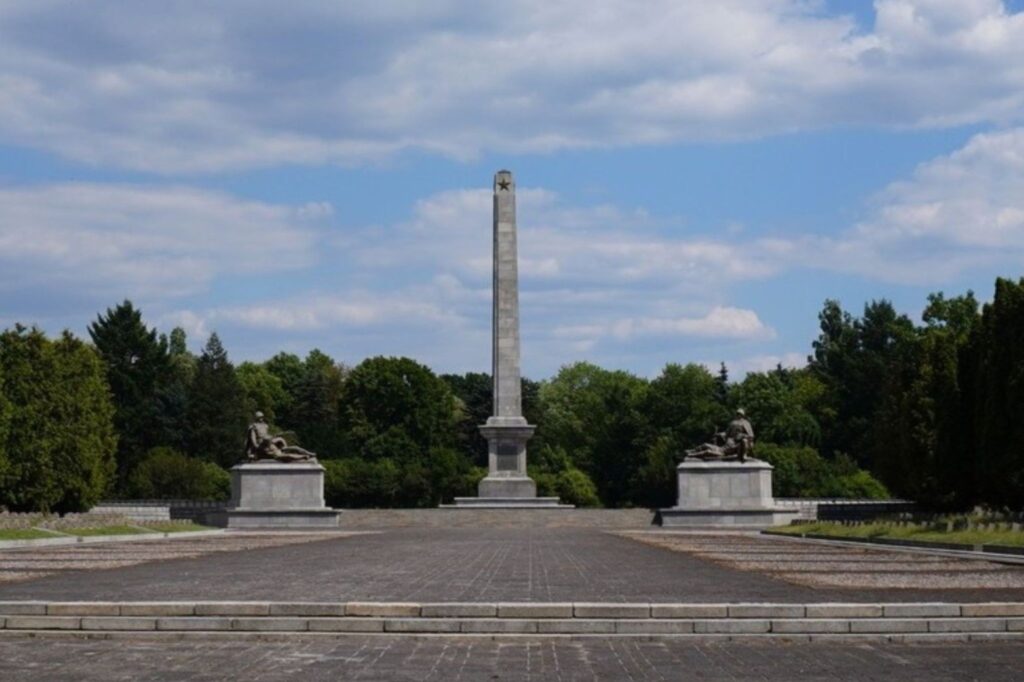 Kirkegården som er opført i socialistisk realistisk stil hylder de soldater der faldt under krigen.