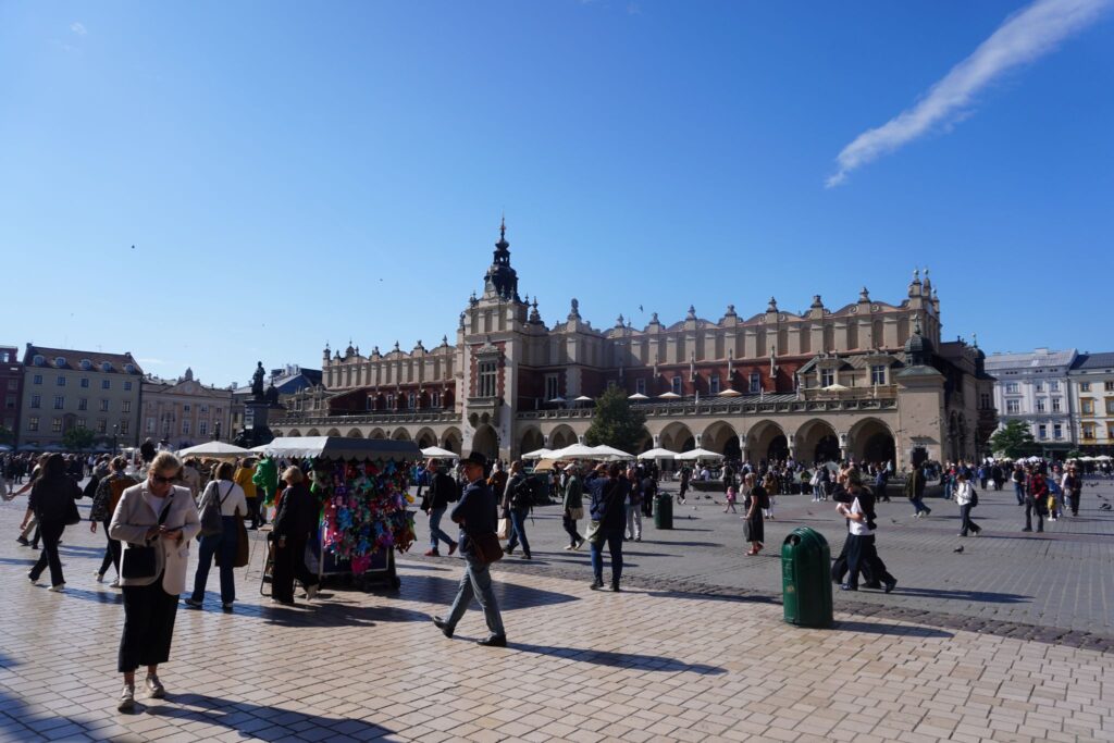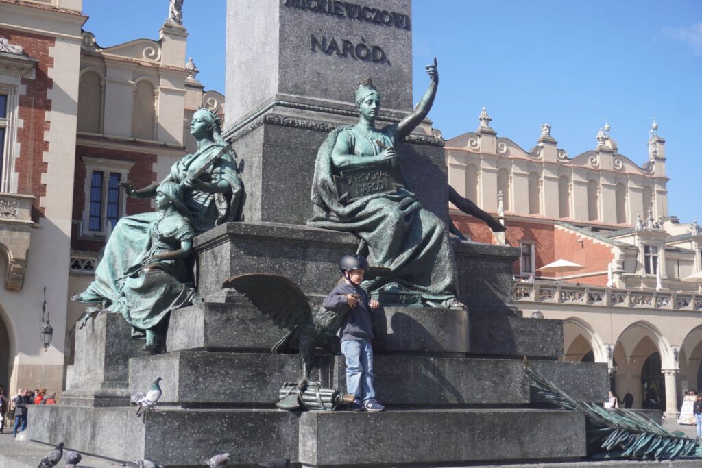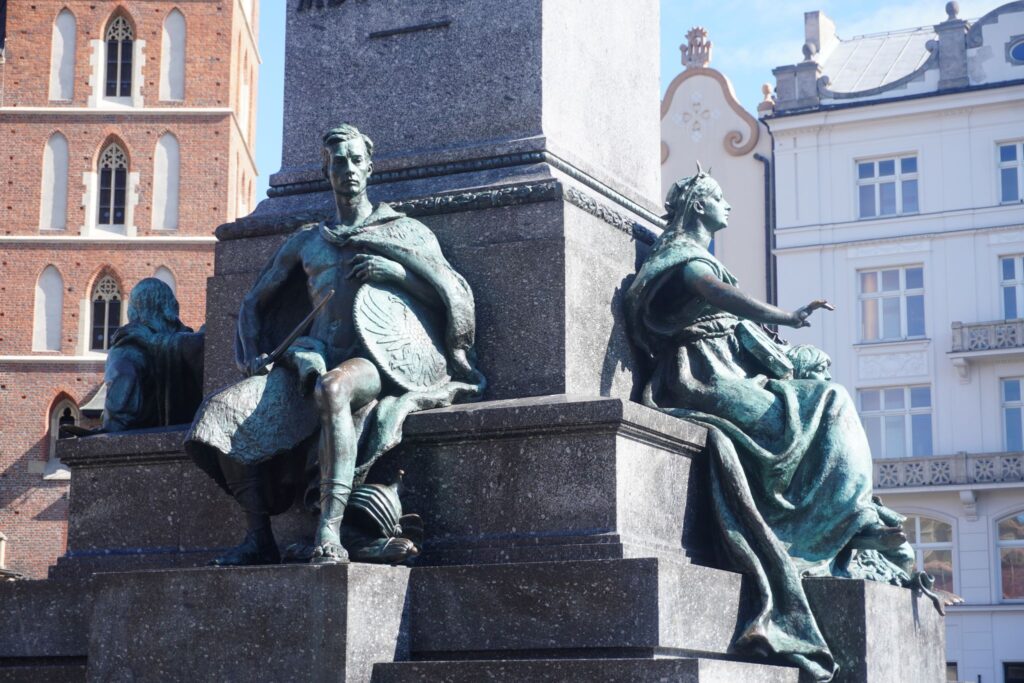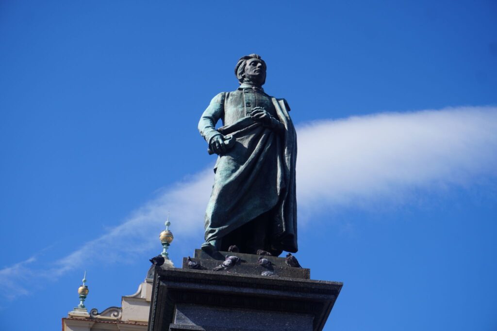 Lige ved siden af Sukiennice kan man se en stor skulptur af digteren Adam Mickiewicz, som udover at være nationalhelt i Polen, også er det i Litauen og Belarus.