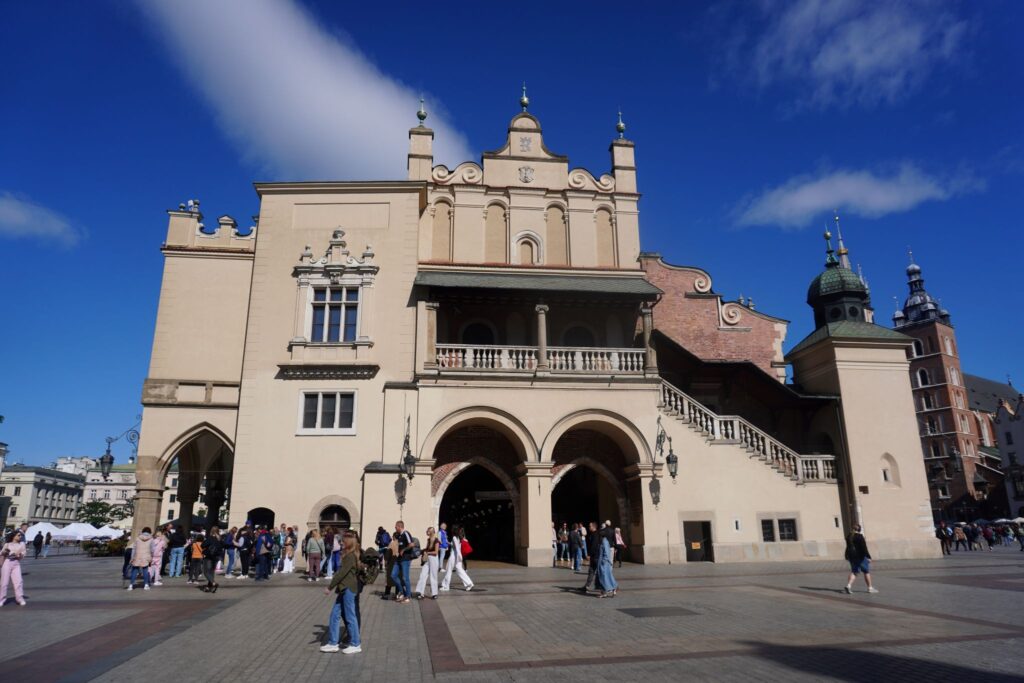 Den mest markante bygning på markedspladsen er Sukiennice, som betyder Tøjhallen. Allerede fra da den blev opført i det 14. århundrede var den tænkt som et sted hvor de forretningsdrivende kunne sælge deres produkter, såsom kryderier, læder, og tekstile varer.