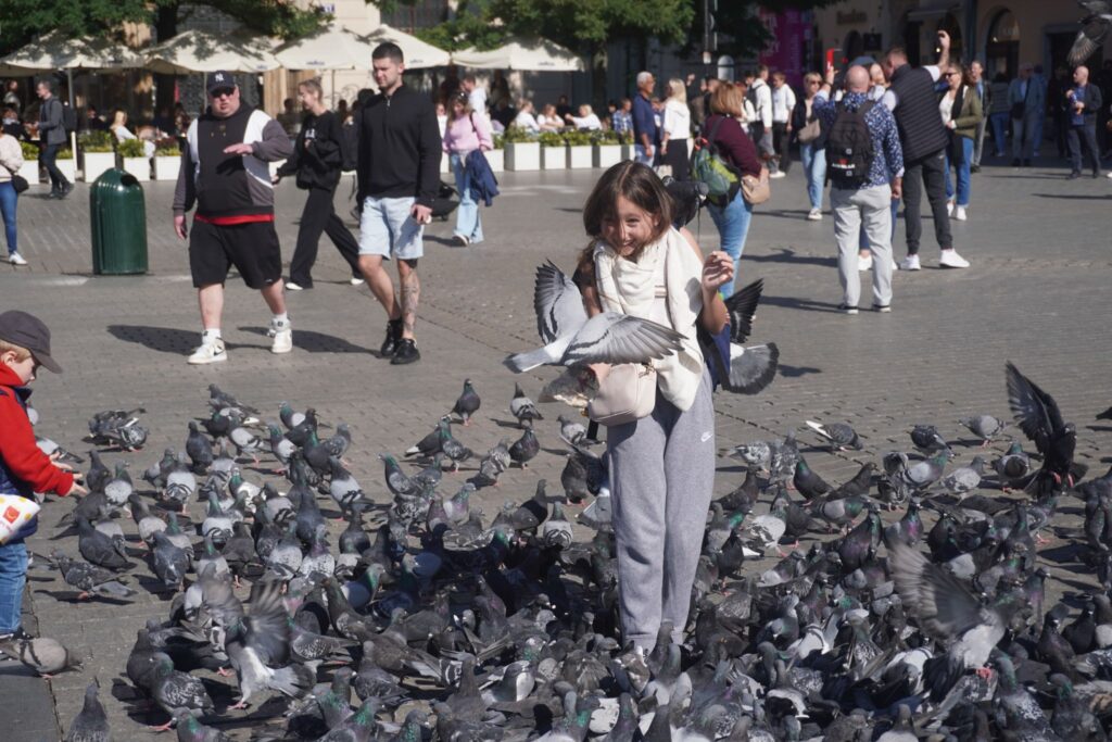Her er der ikke bare folk som samler sig. Det gør også duerne, der hurtig opfanger hvis der er mad på vej til dem.
