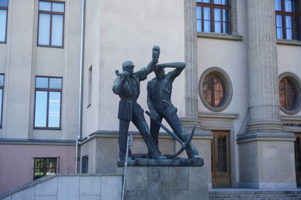 Det arbejdende folk skulle hyldes. Og udenfor AGHs hovedbygning i Krakw kan man se skulpturer udarbejdet af Jan Siek, som bl.a. forestiller ingeniører og minearbejdere.
