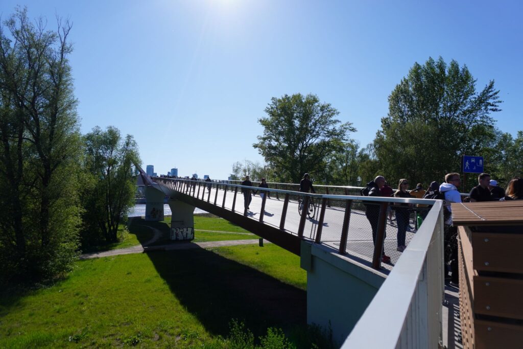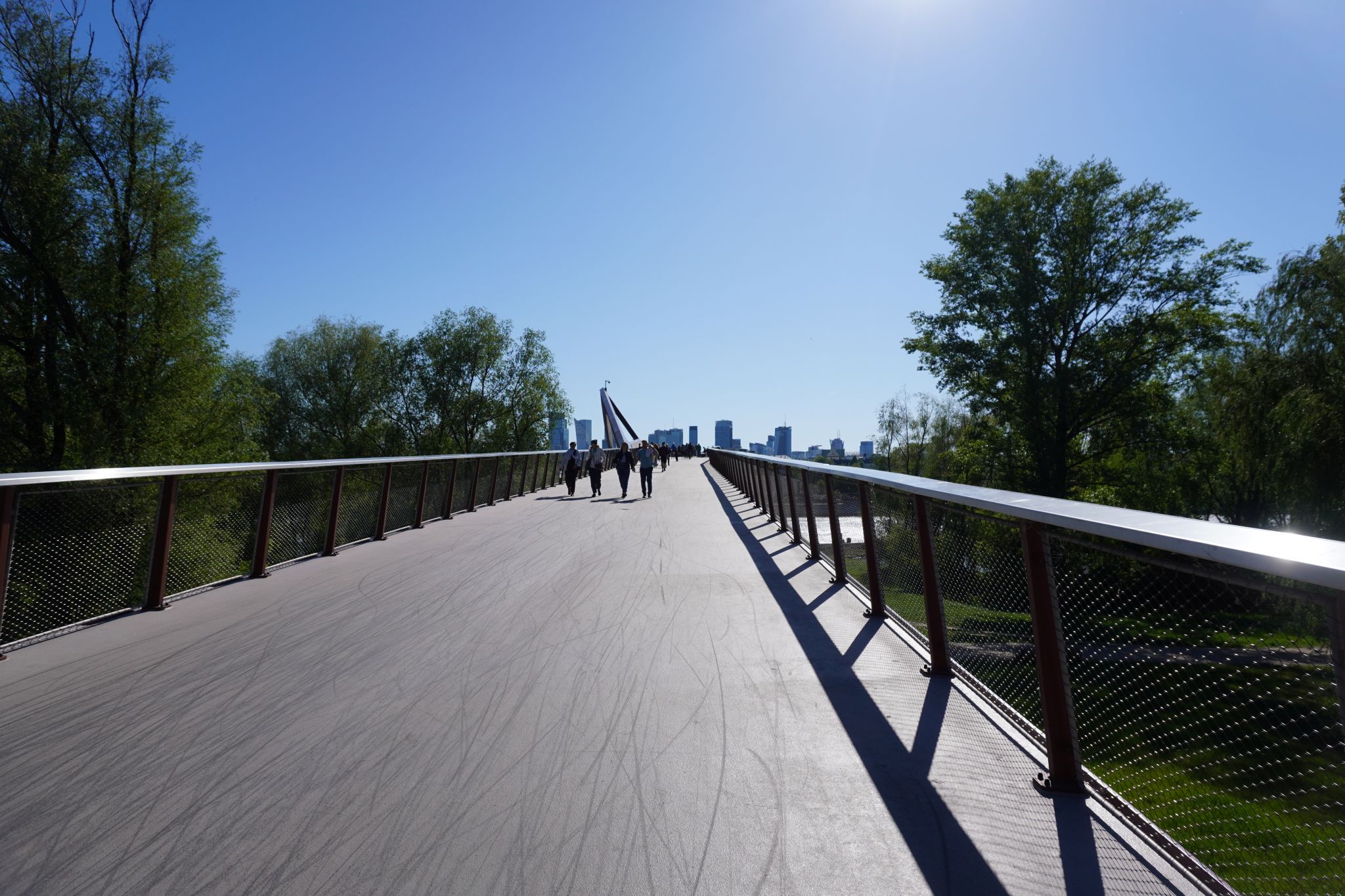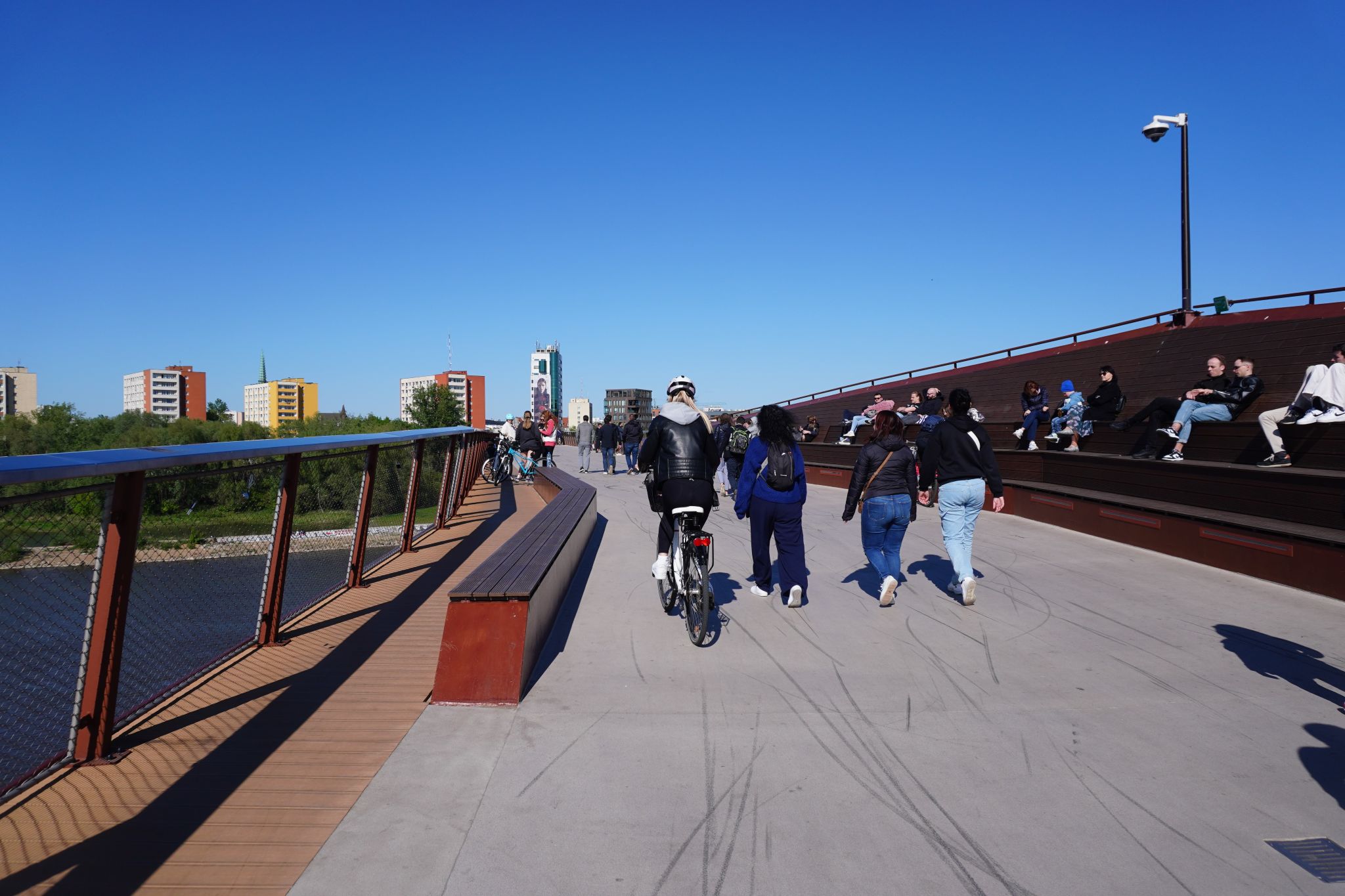 Da jeg bevægede mig fra Powisle siden mod Pragabydelen af Warszawa erfarede jeg hurtig nogle af grundfilosofierne i broen. Da den er et mødested for gående, cyklister og folk som vil slappe af.