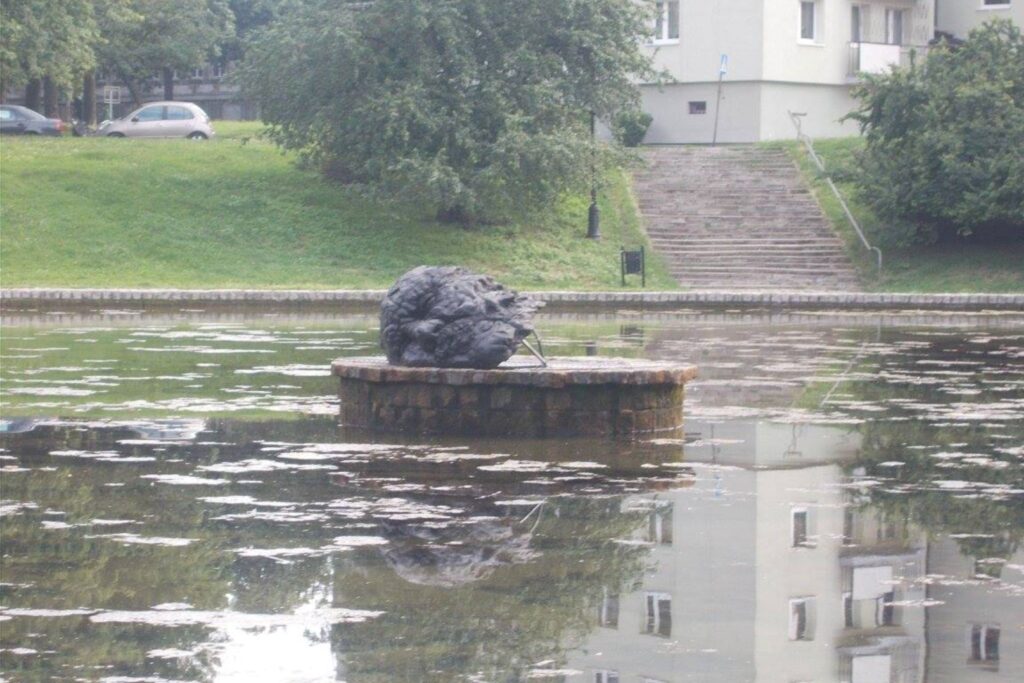 Skulpturen af den døde troendes hoved af Szymon Ryczek, er placeret på en piedestal i Staromiejski parkens dam.