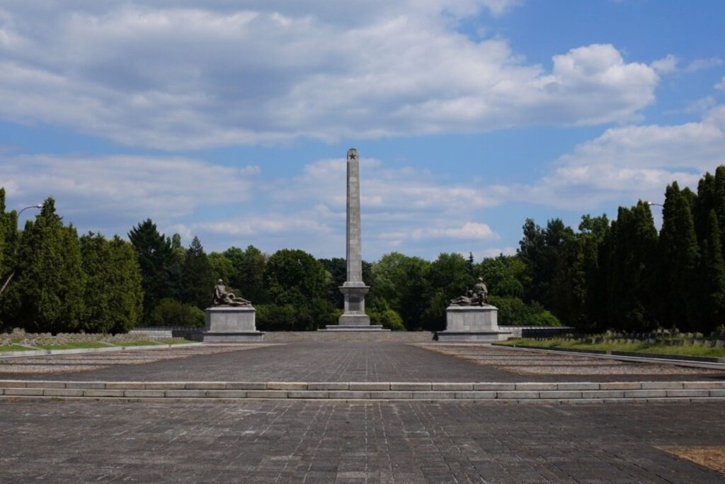 Kirkegården som er opført i socialistisk realistisk stil hylder de soldater der faldt under krigen.