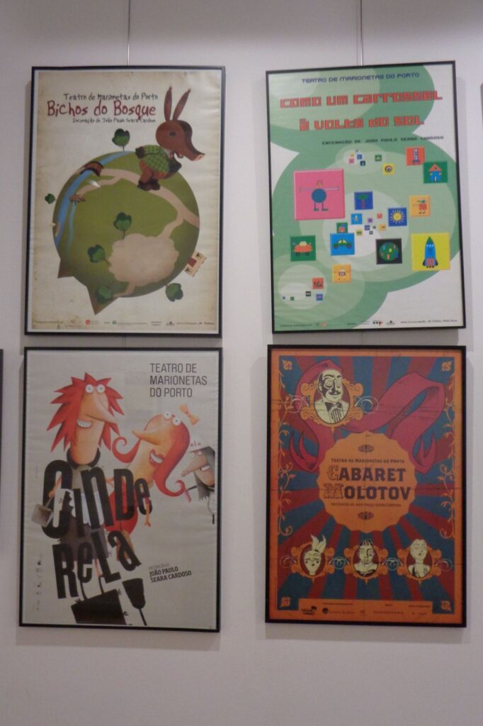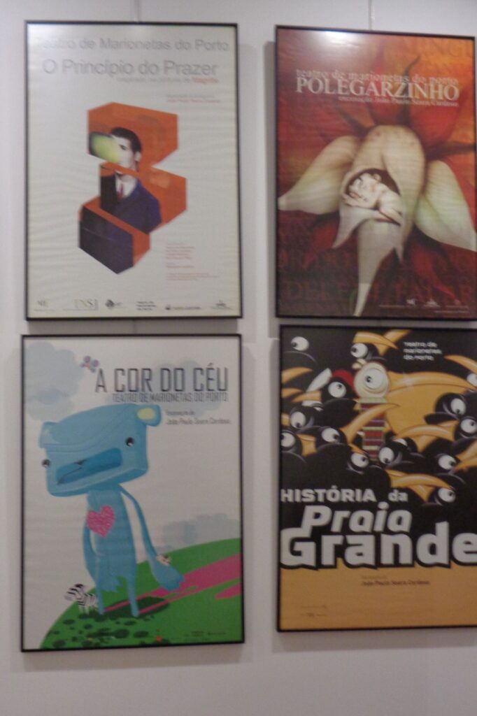 I indgangen til Marionetmuseet i Porto, kan man se en række af de premiereplakater som teatret brugte i deres markedsføring af deres teaterstykker.