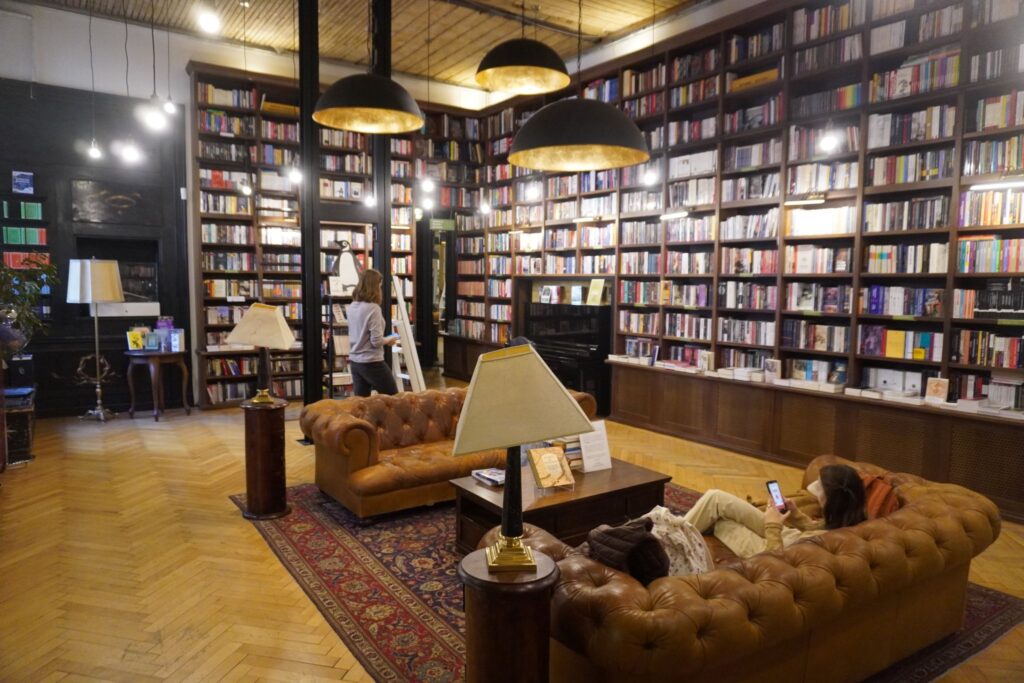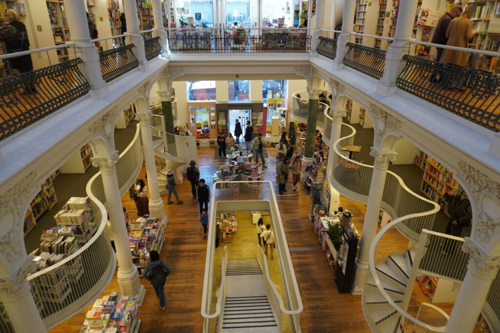 Det store indvendige rum i boghandlens stueetage er markeret af en gaffelformet trappe, som forbinder det til et galleri på første sal med detaljerede træbalustre.