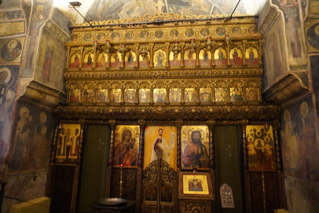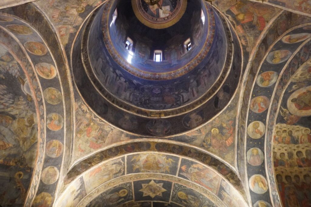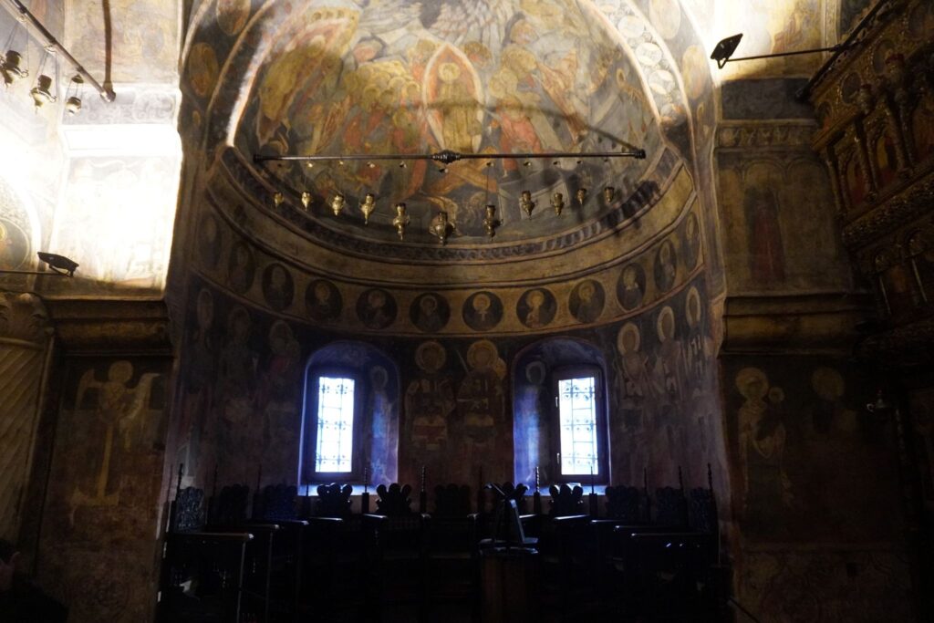 Stavropoleos Klosterkirken er især berømt for sine detaljerede stenhuggerier, elegante søjlegange, smukke freskoer og træskårne ikonostase.
