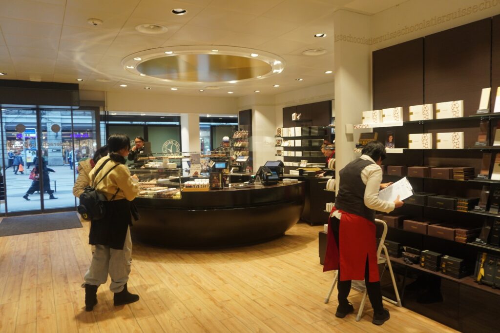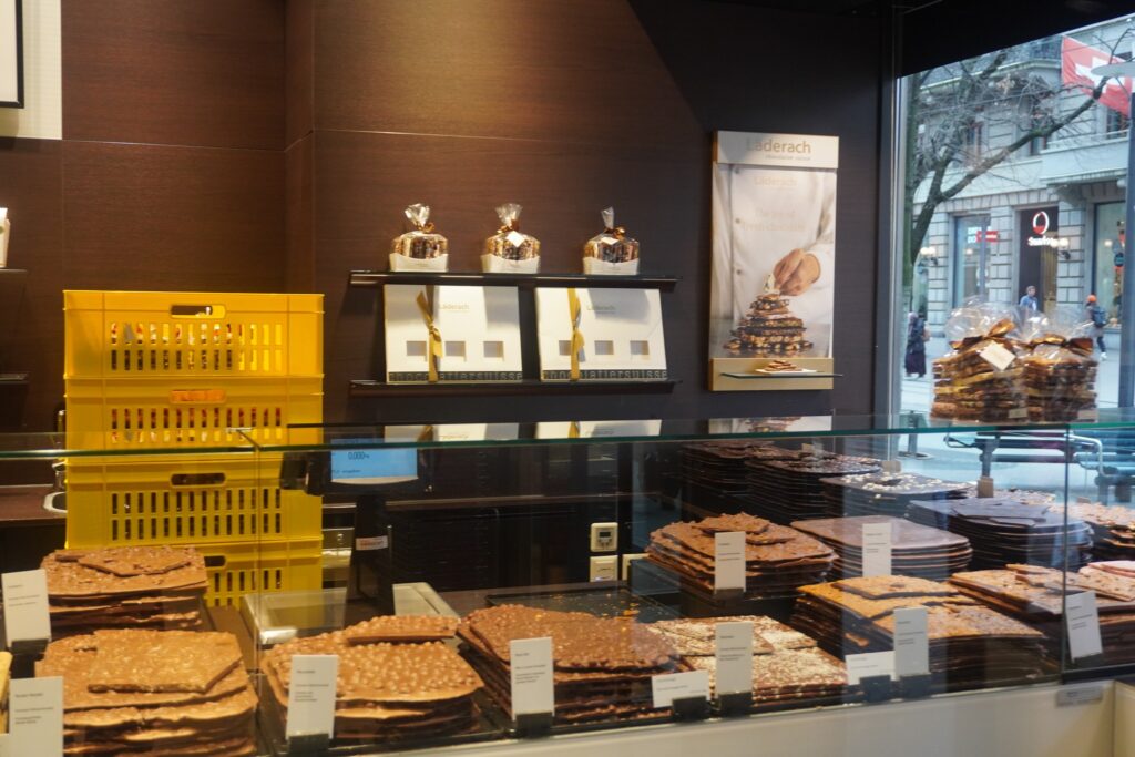 På gaden befinder der mange eksklusive chokolade butikker. Her bliver chokoladen præsenteret som om den er nogle små kunstværker i sig selv.
