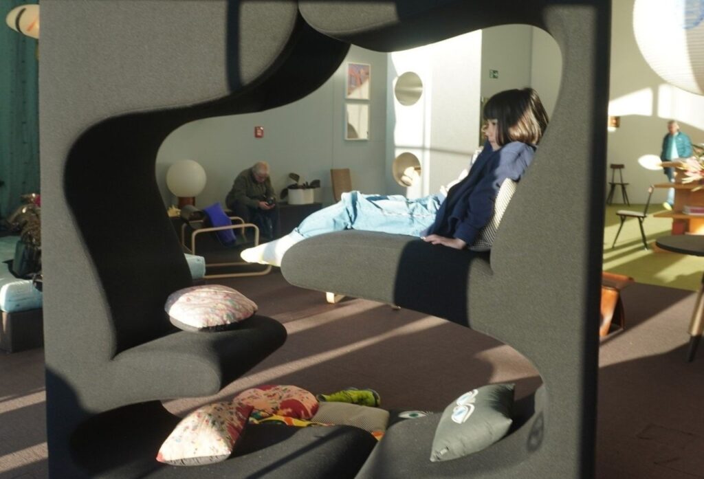 Her kan man sidde i Panton stole som er belyst at et kæmpe lampearrangement han også har designet.