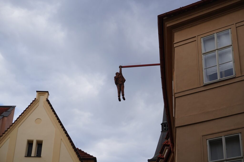 Han kan som mange andre tjekkere godt lide ”at hænge ud”, som et af hans værker hedder. Her kan folk se en hængende skulptur af Sigmund Freud svævende ud fra en af byens tage i Prags indre bys smalle gademiljø.