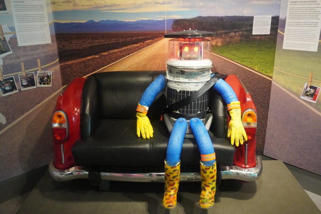 I umiddelbar nærhed af Hitchbot udstillet. Meningen med Hitchbot projektet var at bringe robotten ud på en rejse, ved at blive samlet op af fremmede mennesker på landevejen. Men allerede få dage efter blev den fundet i destrueret tilstand.