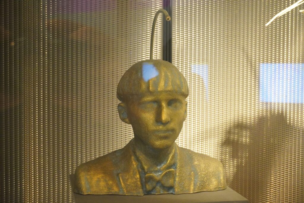 En buste af cyborg-kunstneren Neil Harbisson kan ses bag en montre. Ligesom den virkelige person har skulpturen en antenne påkoblet hjernen. Denne model kan kommunikere med kunstneren på fjern afstand.