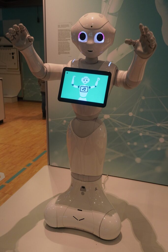 Og ved siden af den står Pepper robotten fra Softbank Robotics, som kan rulle rundt og vejlede mennesker i lufthavne, restauranter, private hjem, og pleje centre, mm.