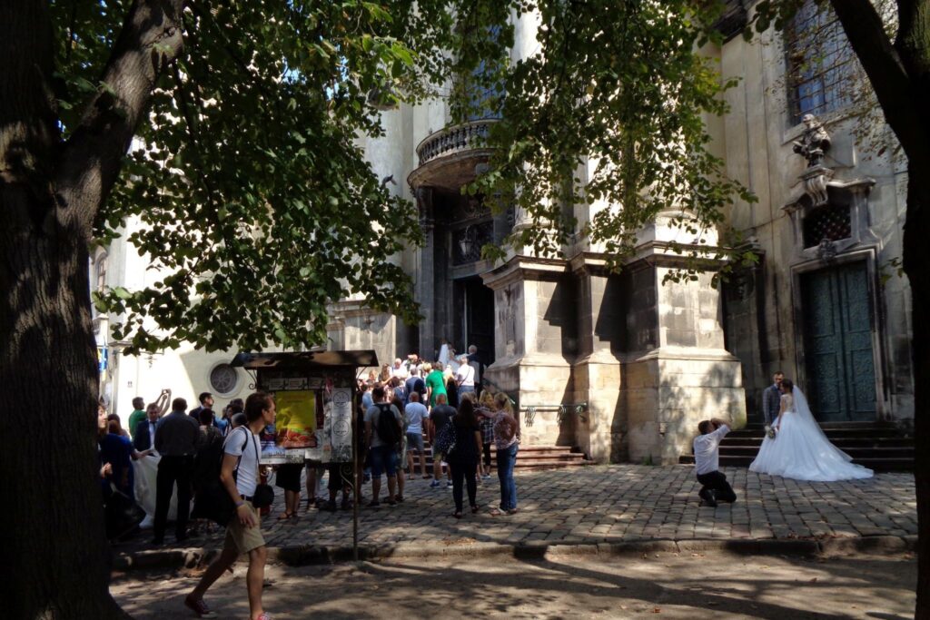 Andet steds i Lvivs centrum blev et brudepar gift i en kirke på en varm indian summer dag.